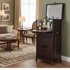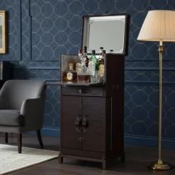 This is more than just a piece of décor; it’s a fully functional and practical liquor cabinet. When opened, it reveals a meticulously organized interior with ample storage for all your bar essentials. The design includes: