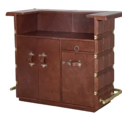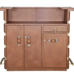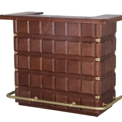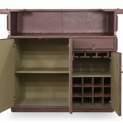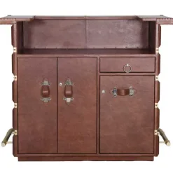 The **Prestige Leather Bar Counter** is a commanding piece that flawlessly blends functional bar utility with a sophisticated, **vintage campaign aesthetic**. Handcrafted for the discerning host, this counter serves as both a stunning focal point and a comprehensive storage solution for your entire bar collection.