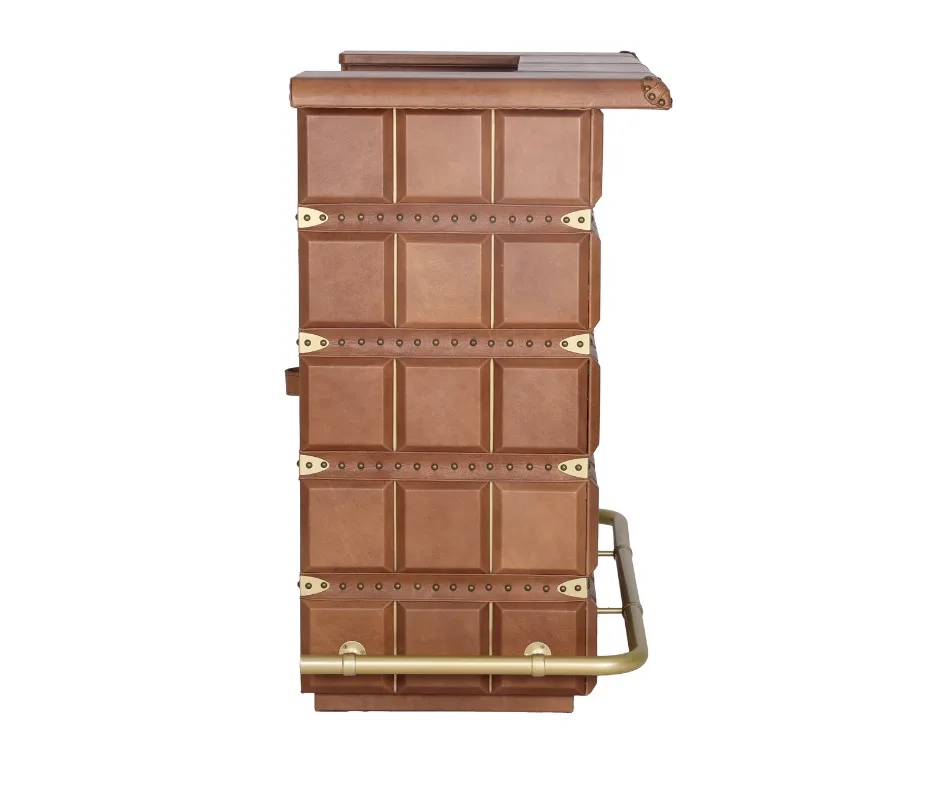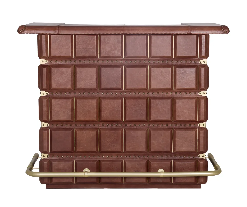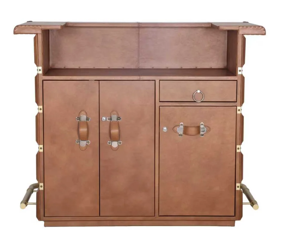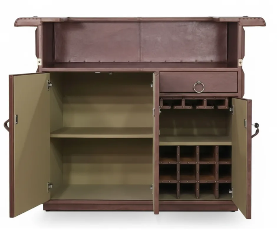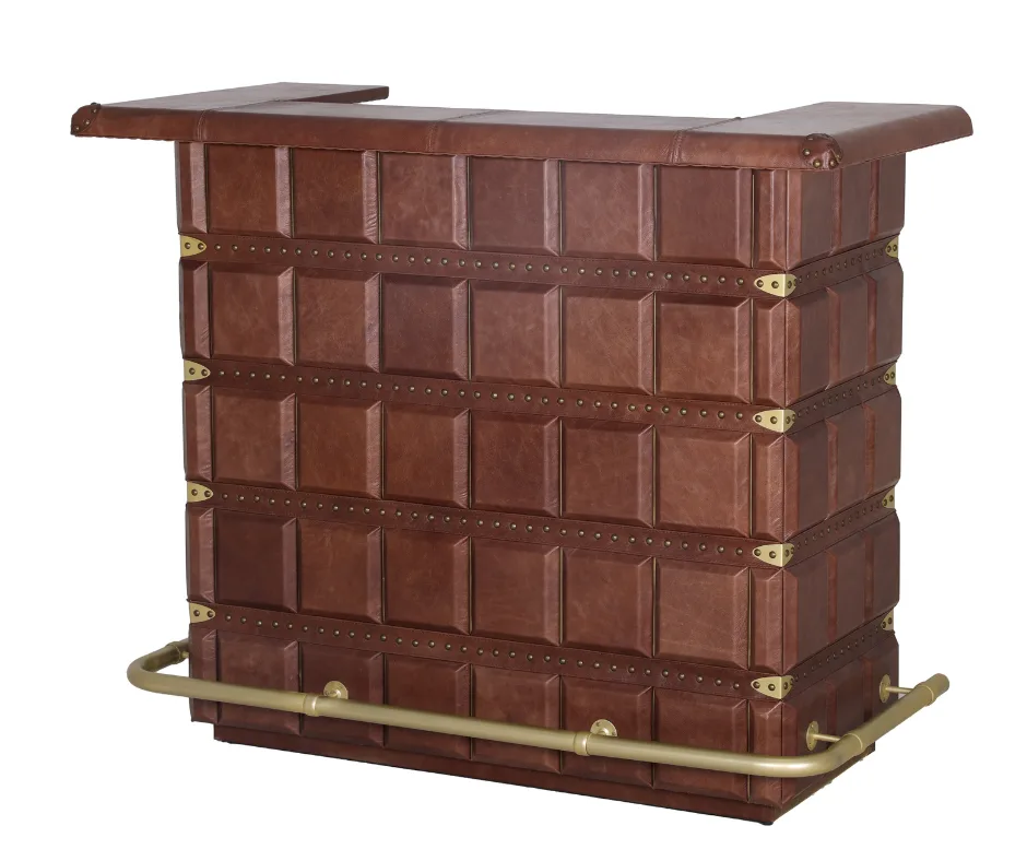 The **Prestige Leather Bar Counter** is a commanding piece that flawlessly blends functional bar utility with a sophisticated, **vintage campaign aesthetic**. Handcrafted for the discerning host, this counter serves as both a stunning focal point and a comprehensive storage solution for your entire bar collection.