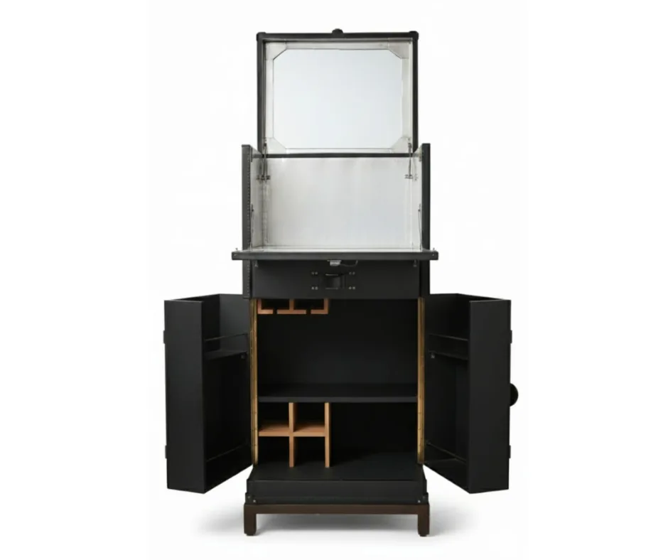 - Ultimate Versatility: The top section flips open to reveal a large mirrored back panel and polished metallic (aluminum/stainless steel) lining, providing a chic and durable surface for mixing cocktails. The drop-down front creates a convenient working prep surface.