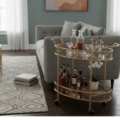 Trellis Drinks Trolley with bottle holder, with glass shelves, oval shape. Set your bar on the cart or serve the drinks in style.