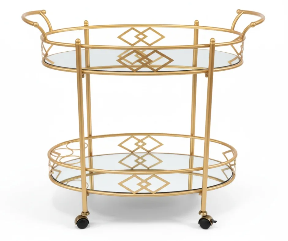 Trellis Drinks Trolley with bottle holder, with glass shelves, oval shape. Set your bar on the cart or serve the drinks in style.