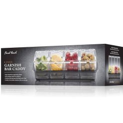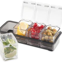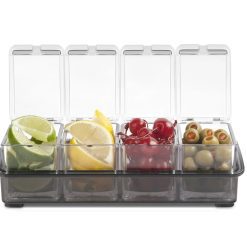 Keep your garnishes for crafty cocktails organized and sanitary with this four tray garnish bar caddy. Each container holds up to 6¾ oz (200 ml) of cherries, olives, lemons or limes and the built-in lids on each container help keep everything fresh and clean. Simply remove each container from the base for easy cleaning when finished.