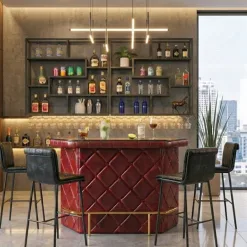 This bold counter comes with an easy to clean brown wooden grain top, along with a substantial amount of storage space. The space including a 15 bottle wine rack, stem glass hanging area. More features of this bar counter are further highlighted through front look of PU in earthy tones of Cherry and Black Top, on front and side gold foot rail.